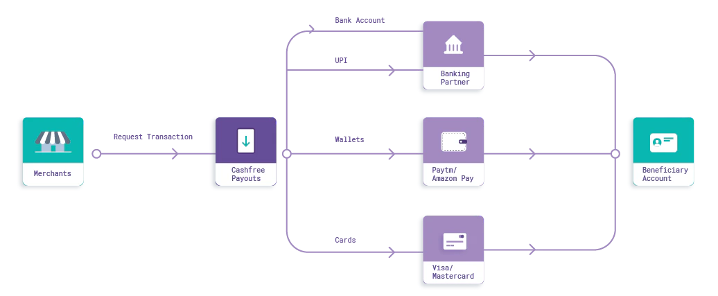 - Manage multiple payout methods: IMPS, NEFT, UPI, Mastercard (MoneySend), Visa (Visa Direct), and digital wallets (Amazon Pay & Paytm).