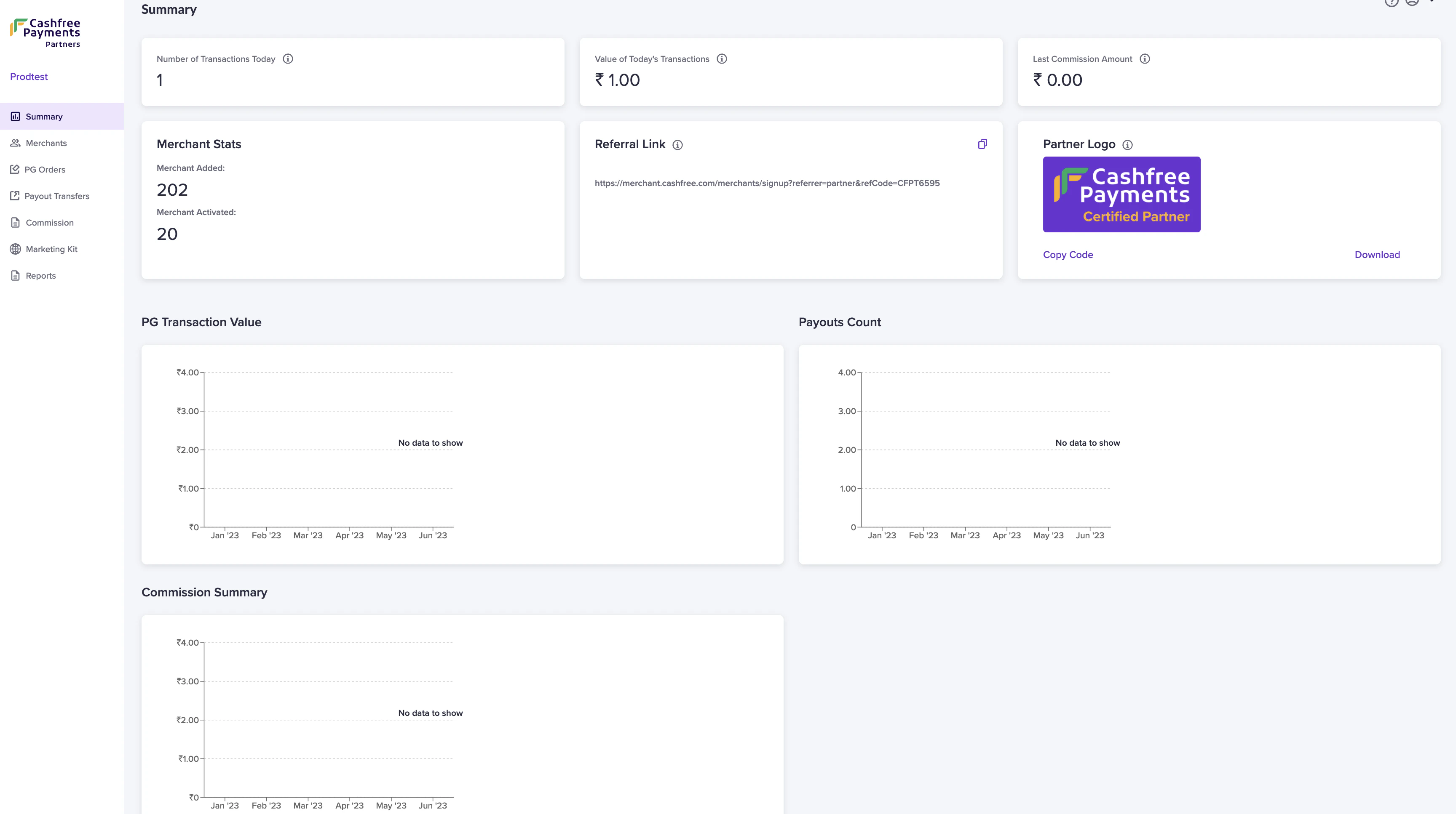 The Summary screen gives you details about your daily transactions, like the current-day transaction count, the value of the transactions made by your merchants, and the last commission amount you received from Cashfree Payments as per the referral program. The following details are available on this page -- Number of Transactions Today - Total number of PG and Payout transactions done by your merchants.