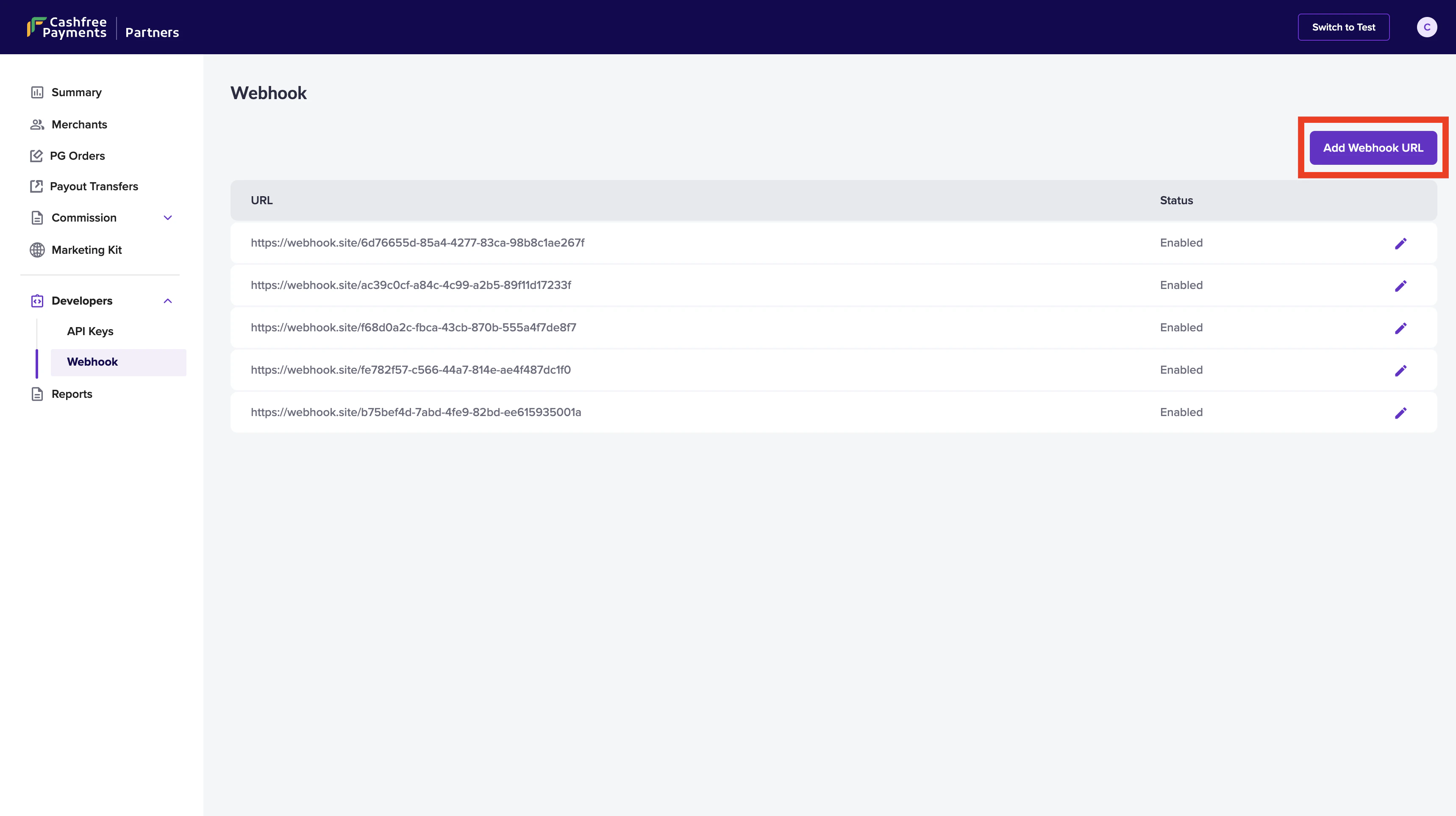 1. Go to Partner Dashboard > Developers > Webhooks.
