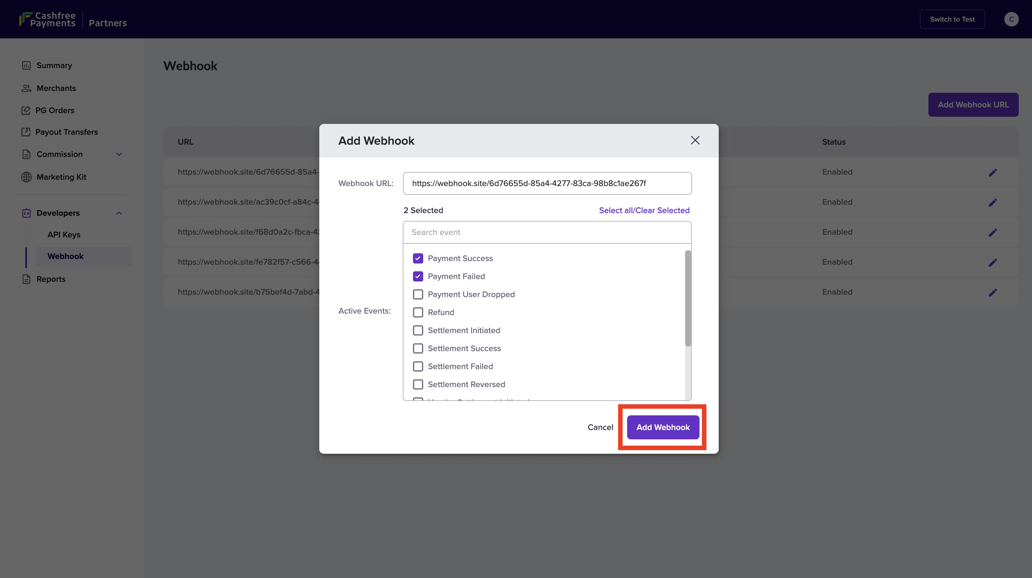 2. Select the events for which you want to configure the webhooks to receive updates, and click Add Webhook.