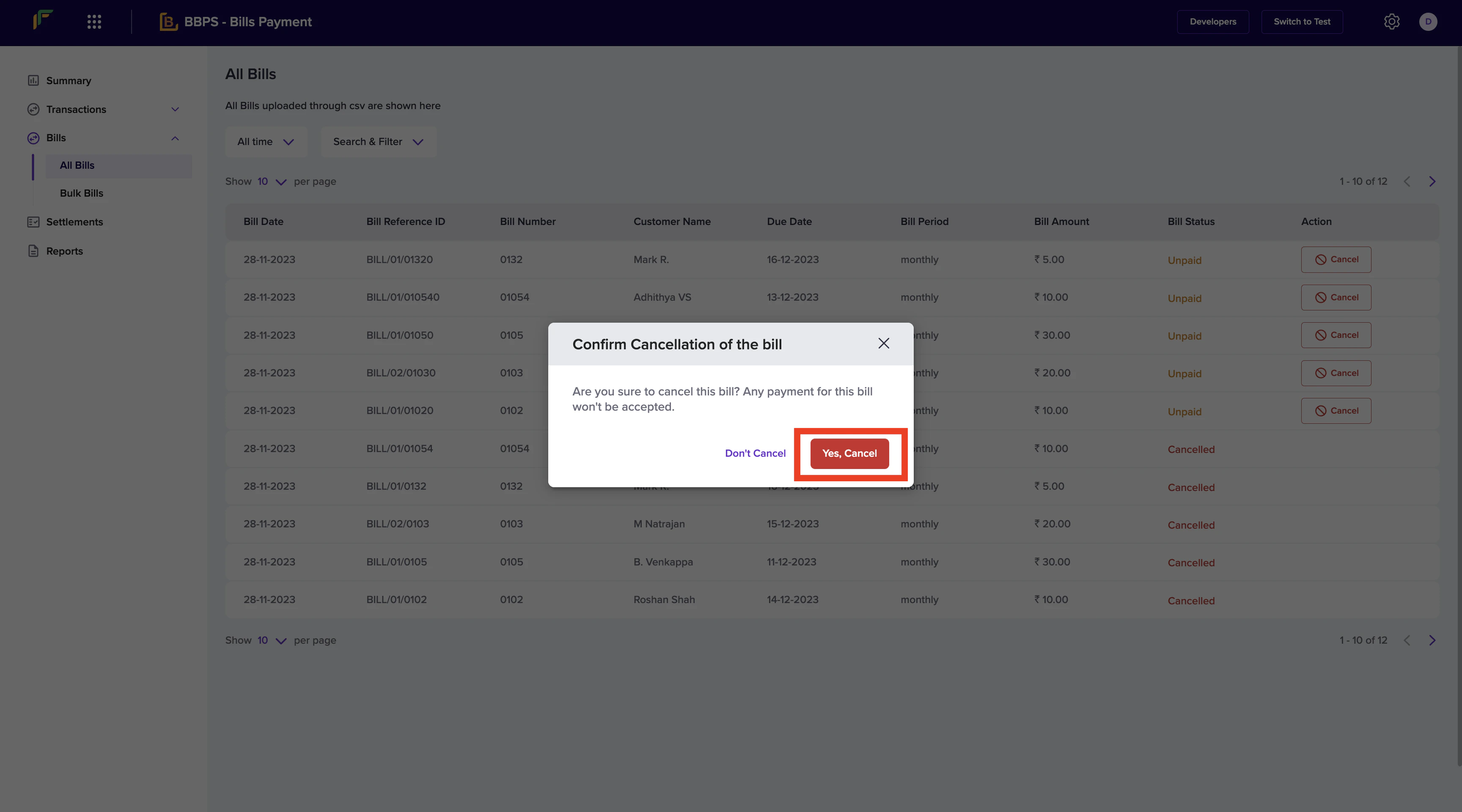 Click the Cancel button from the Actions tab to cancel the bill. Note that any payment for this bill wonβt be accepted post this.