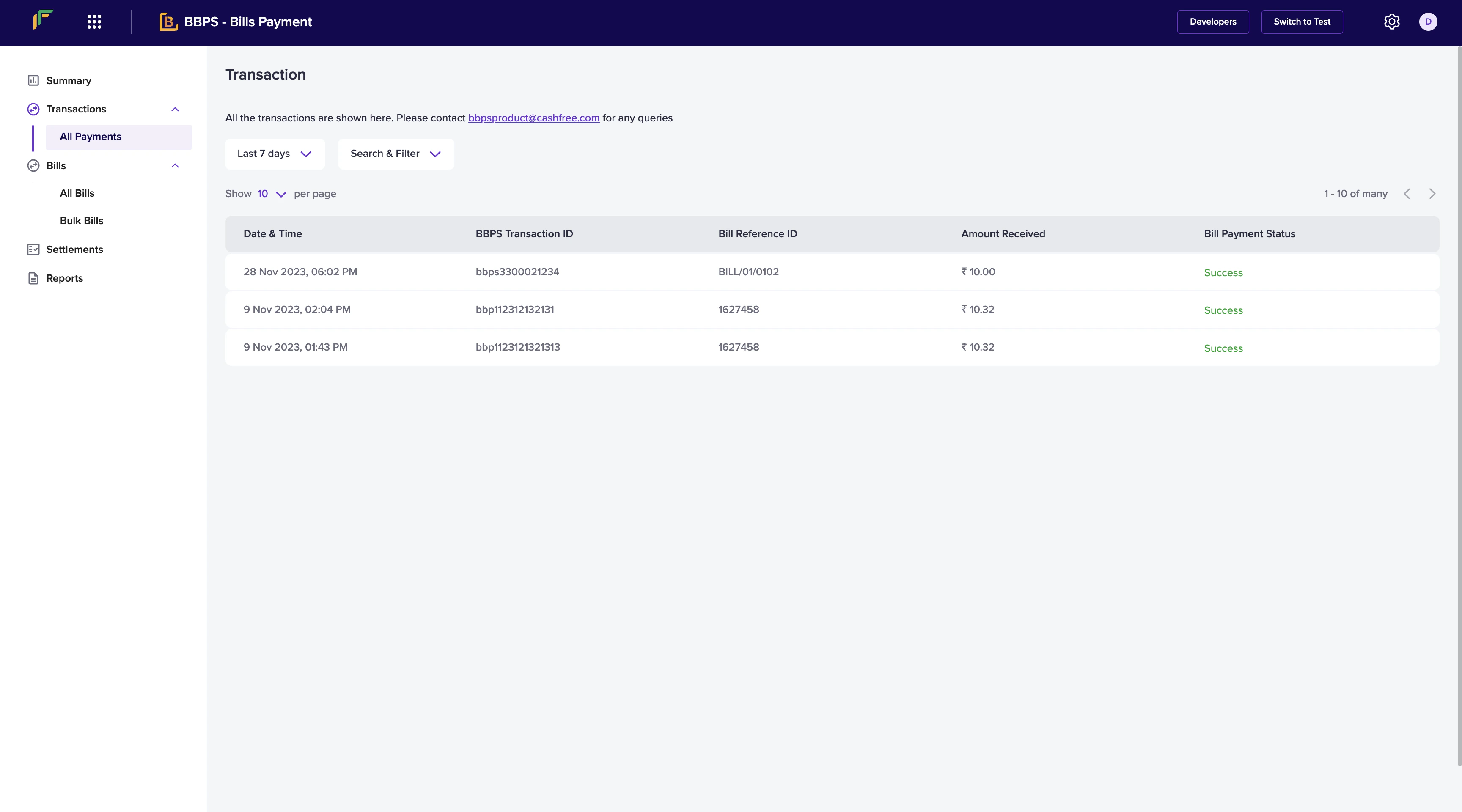 You can apply search on the following parameters: BBPS Transaction ID and Biller Reference ID You can apply filter on Bill Payment Status.