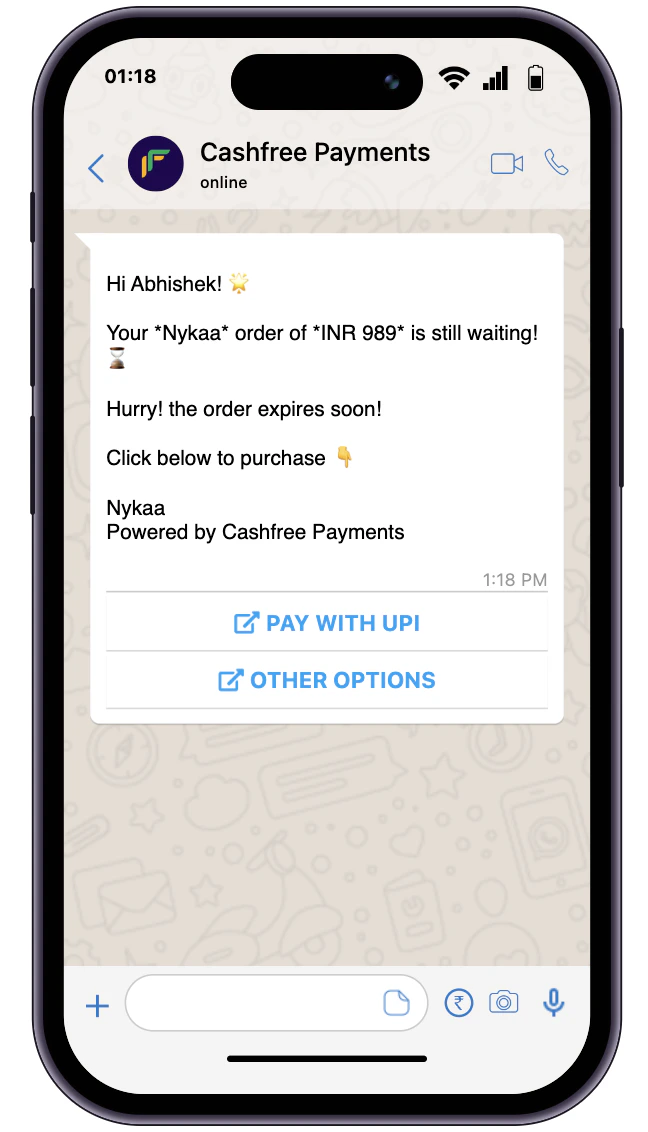 - β Pay via UPI: Customers can directly complete their payment from WhatsApp in just 1 click using the UPI intent flow.