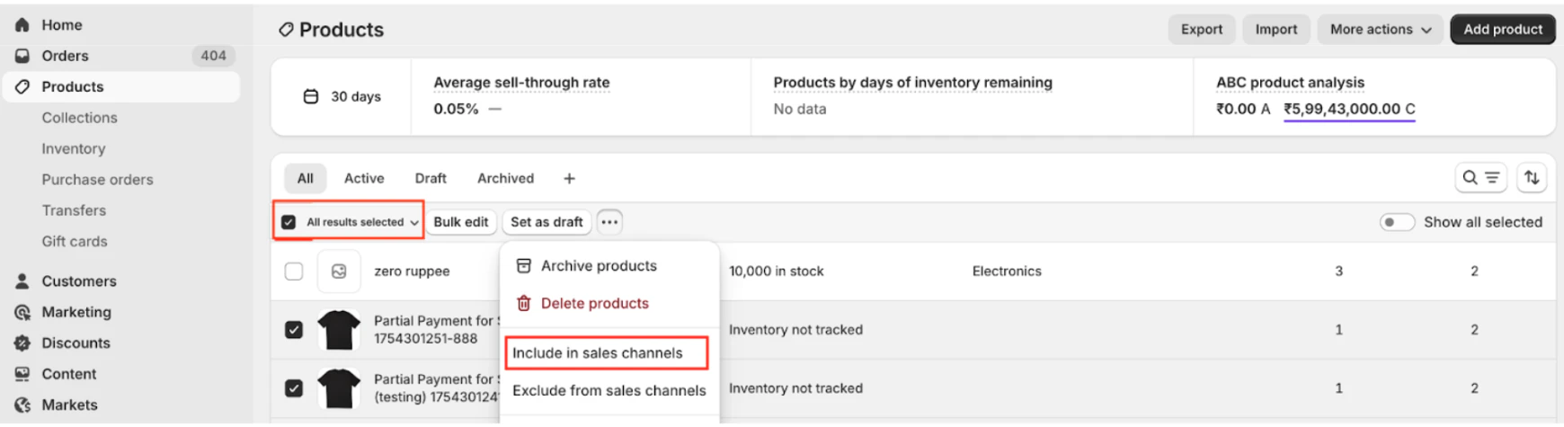 Ensure Cashfree is added as Sales Channel for all your products in Shopify.- Navigate to Products > All in your Shopify store admin.