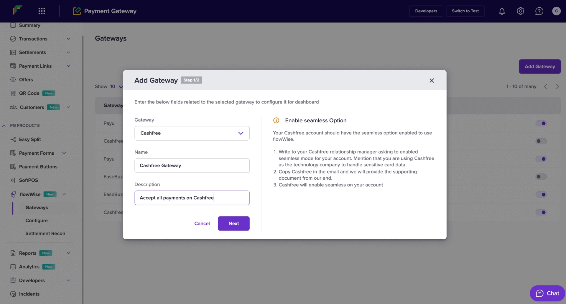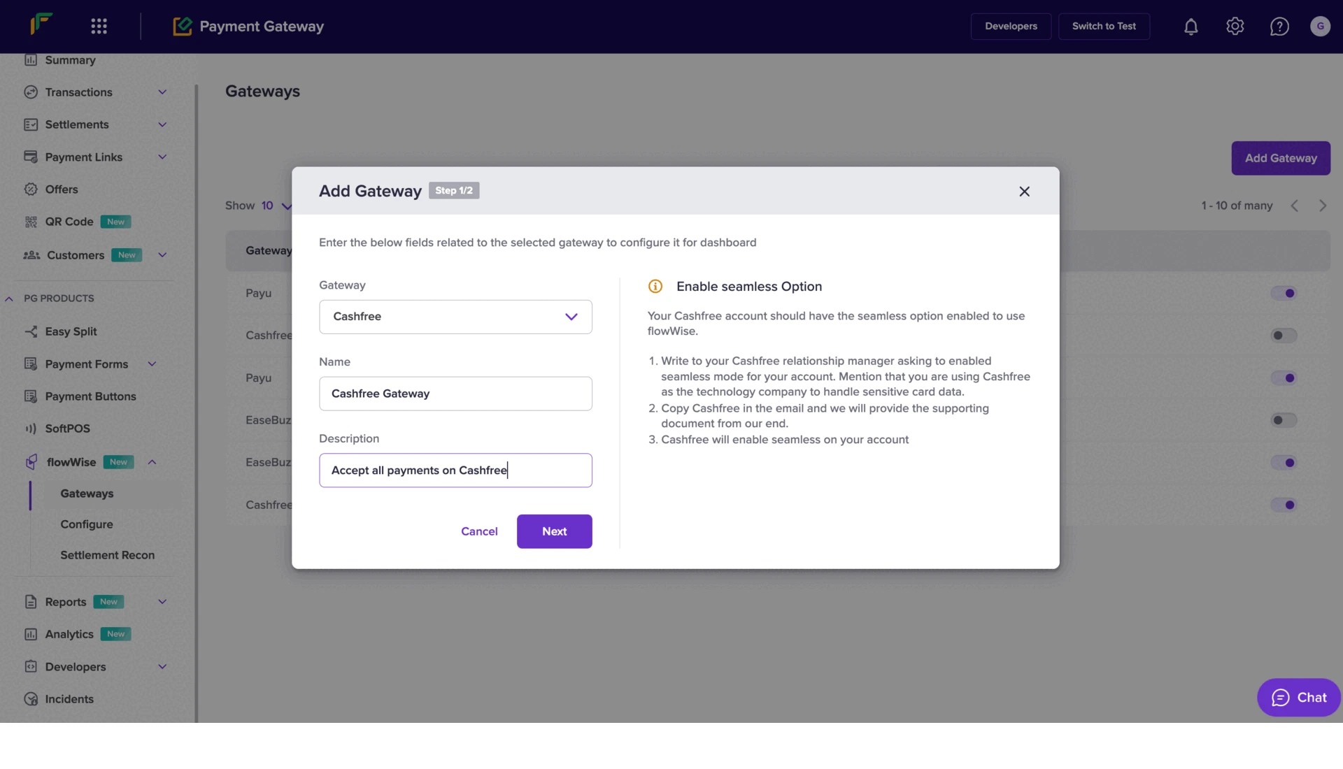3. On the top right, click on ‘Add Gateways’. Select Cashfree from dropdown, and add a unique name and description for the gateway. Then hit ‘next’