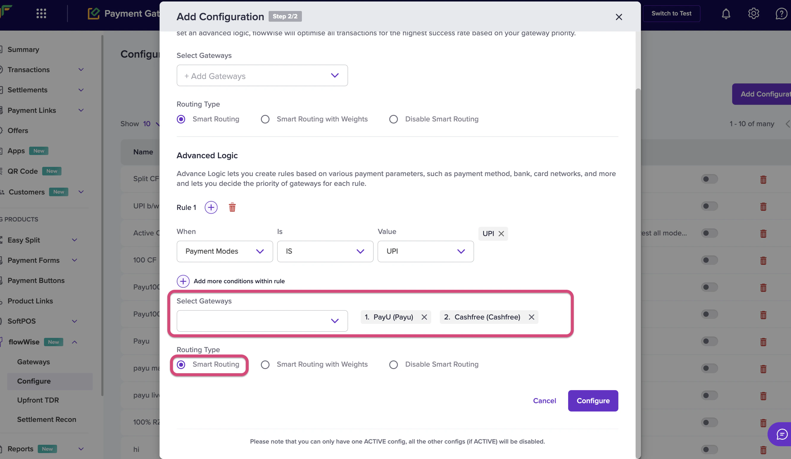 With Smart Routing, Flowwise automatically directs payments to the best gateway based on success rates over recent timeframes (e.g., last 15 or 30 minutes). Simply define your selected gateways in a rule set, and Flowwise handles the rest.