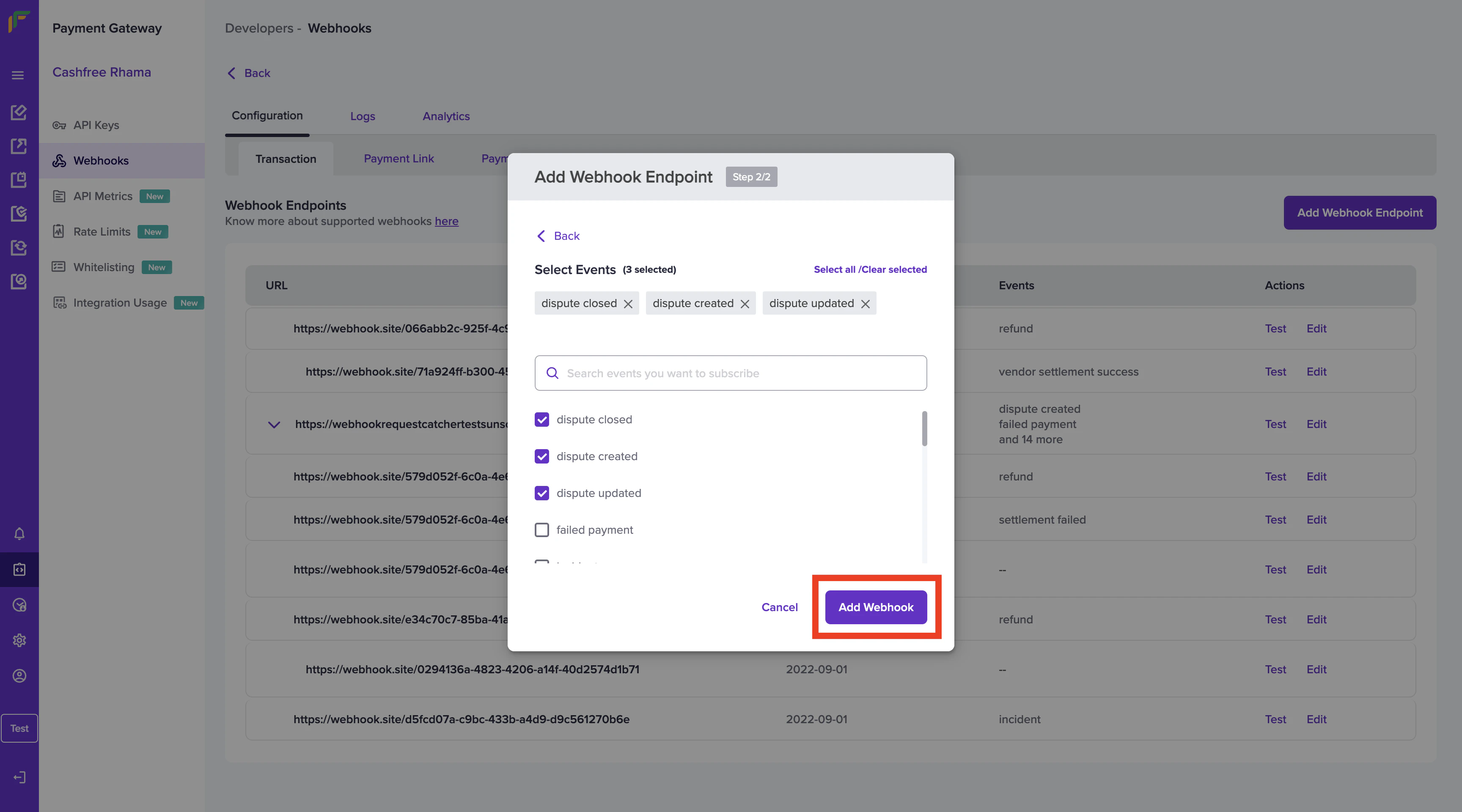 - Select the respective event and click Add Webhook.