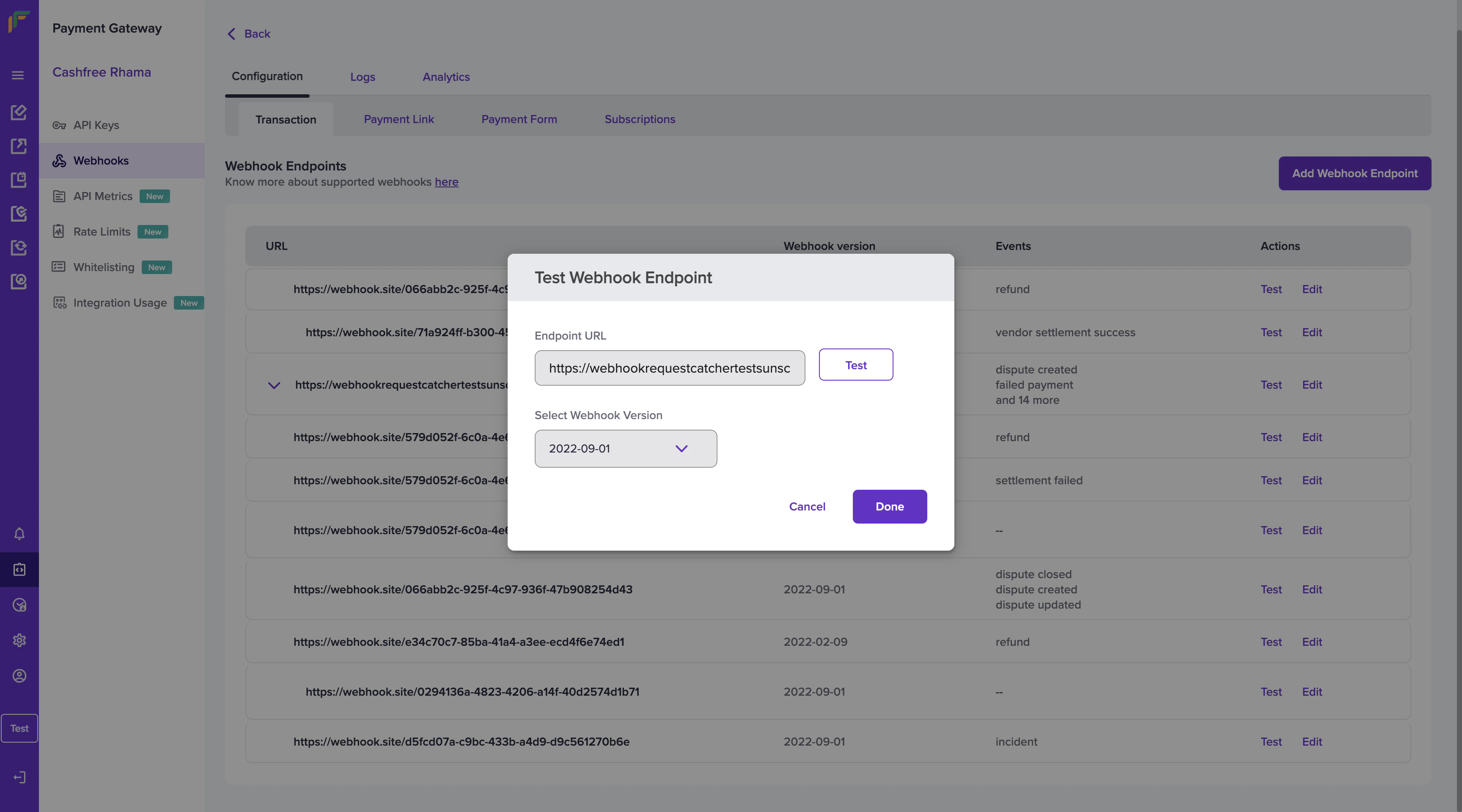 You can test the URL at any time using the Test option. Click the Test option in the Test Webhook Endpoint pop-up. Click Done once you get a successful response.