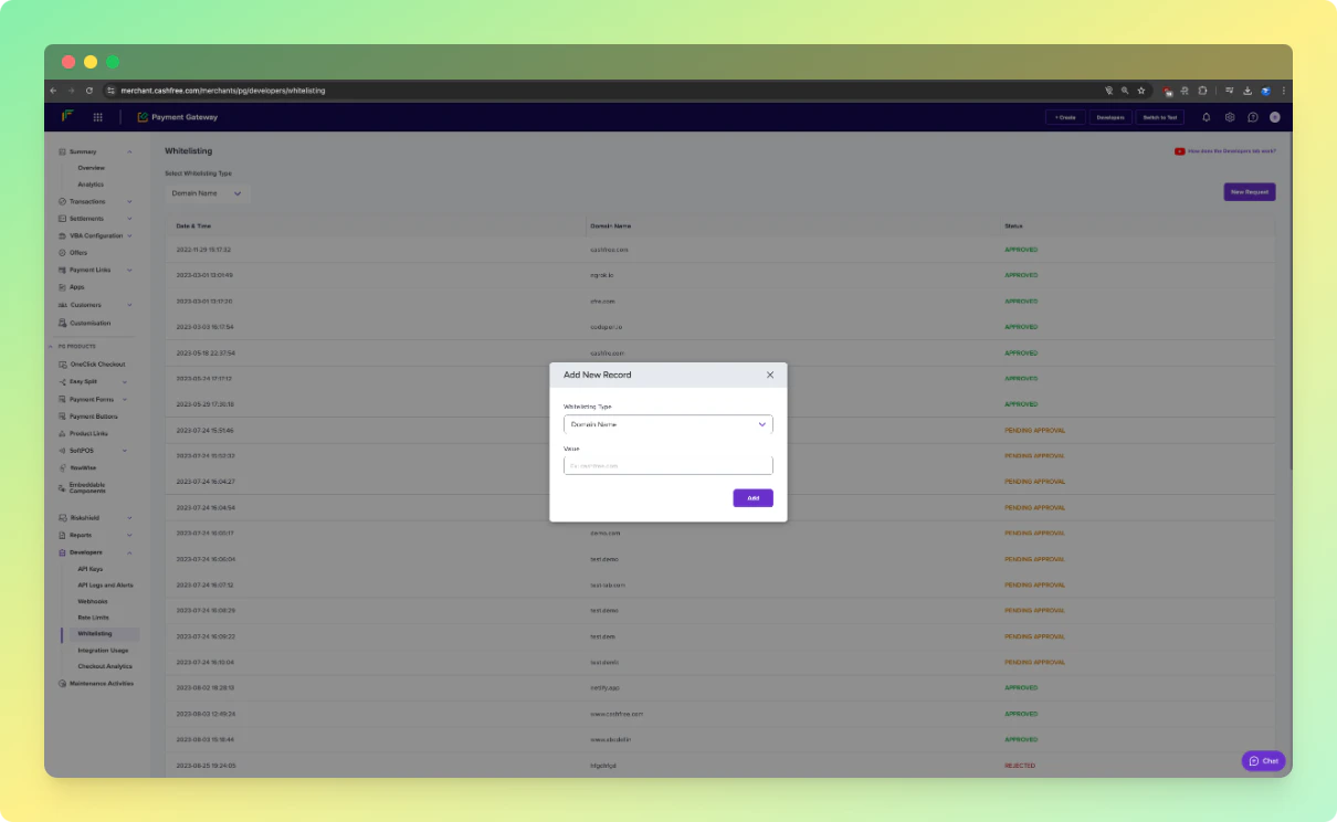 - Go to Payment Gateway Dashboard > Developers > Whitelisting.