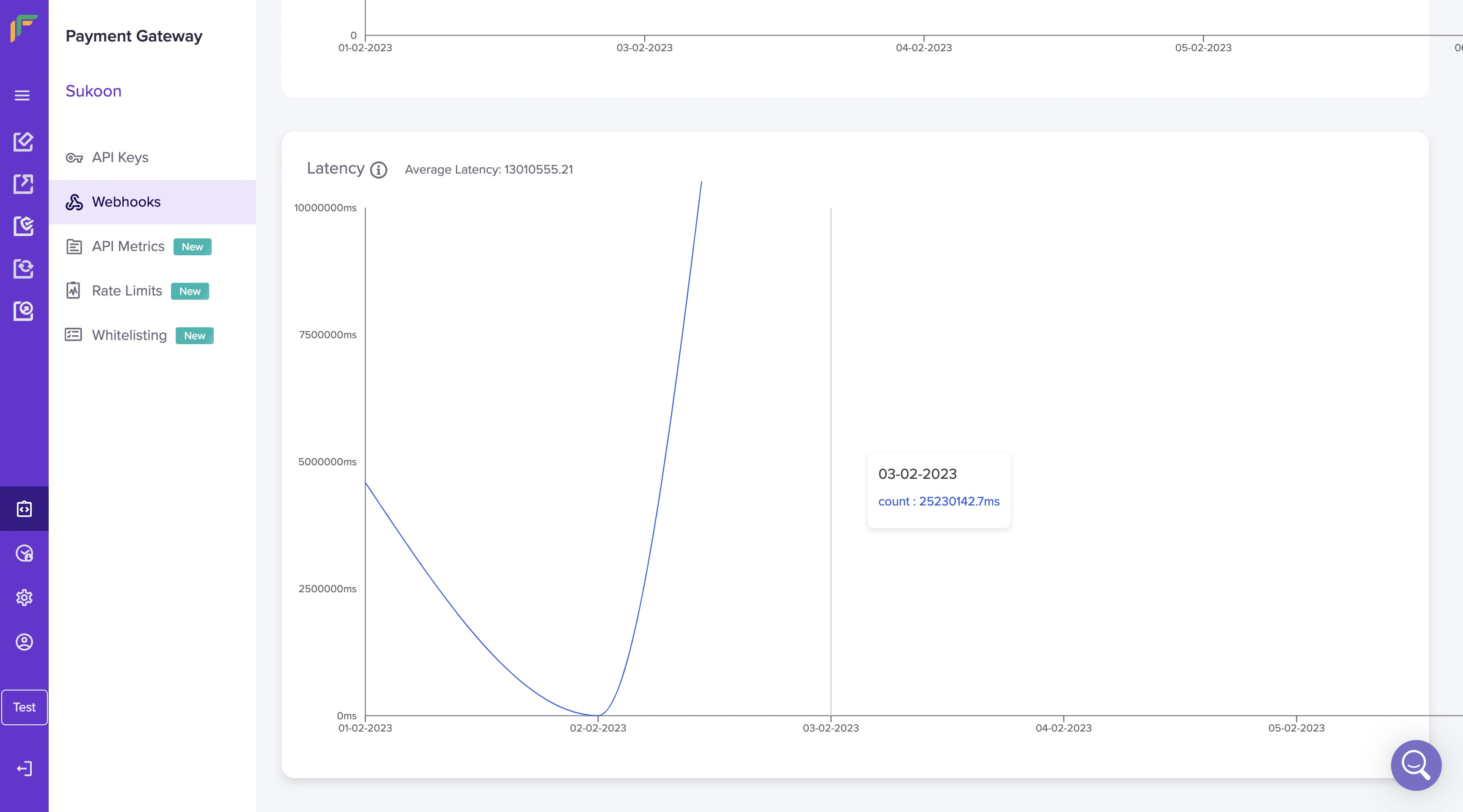 Latency is the time taken to respond to webhooks. Hover your mouse over the individual date to view the latency count. The average latency value is also provided.