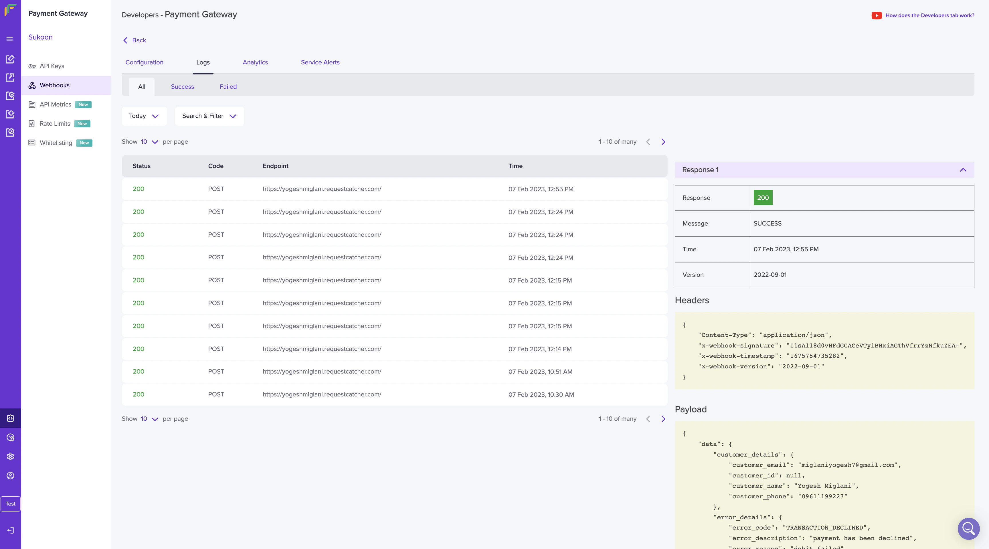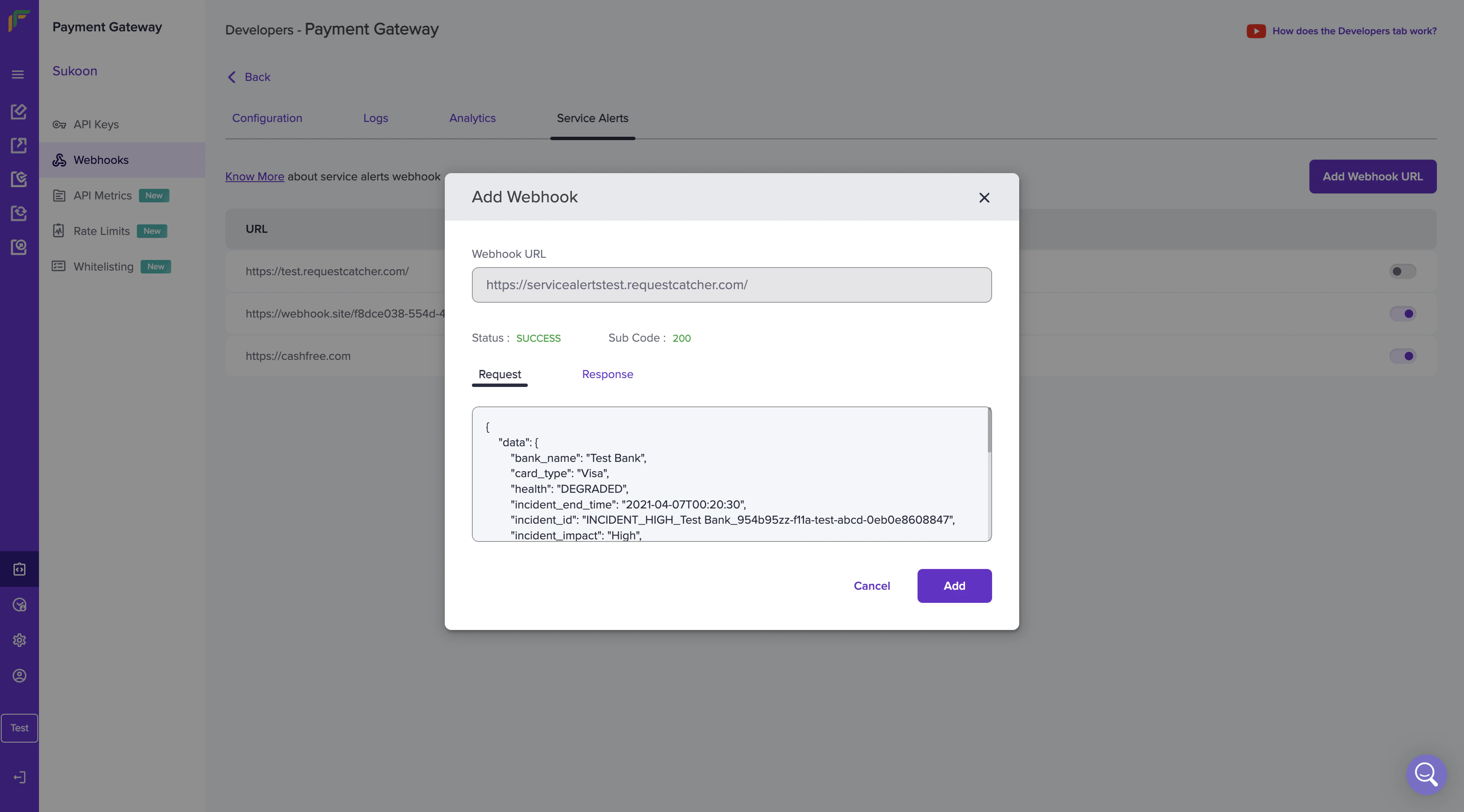 - Go to Payment Gateway Dashboard > Developers > Service Alerts,