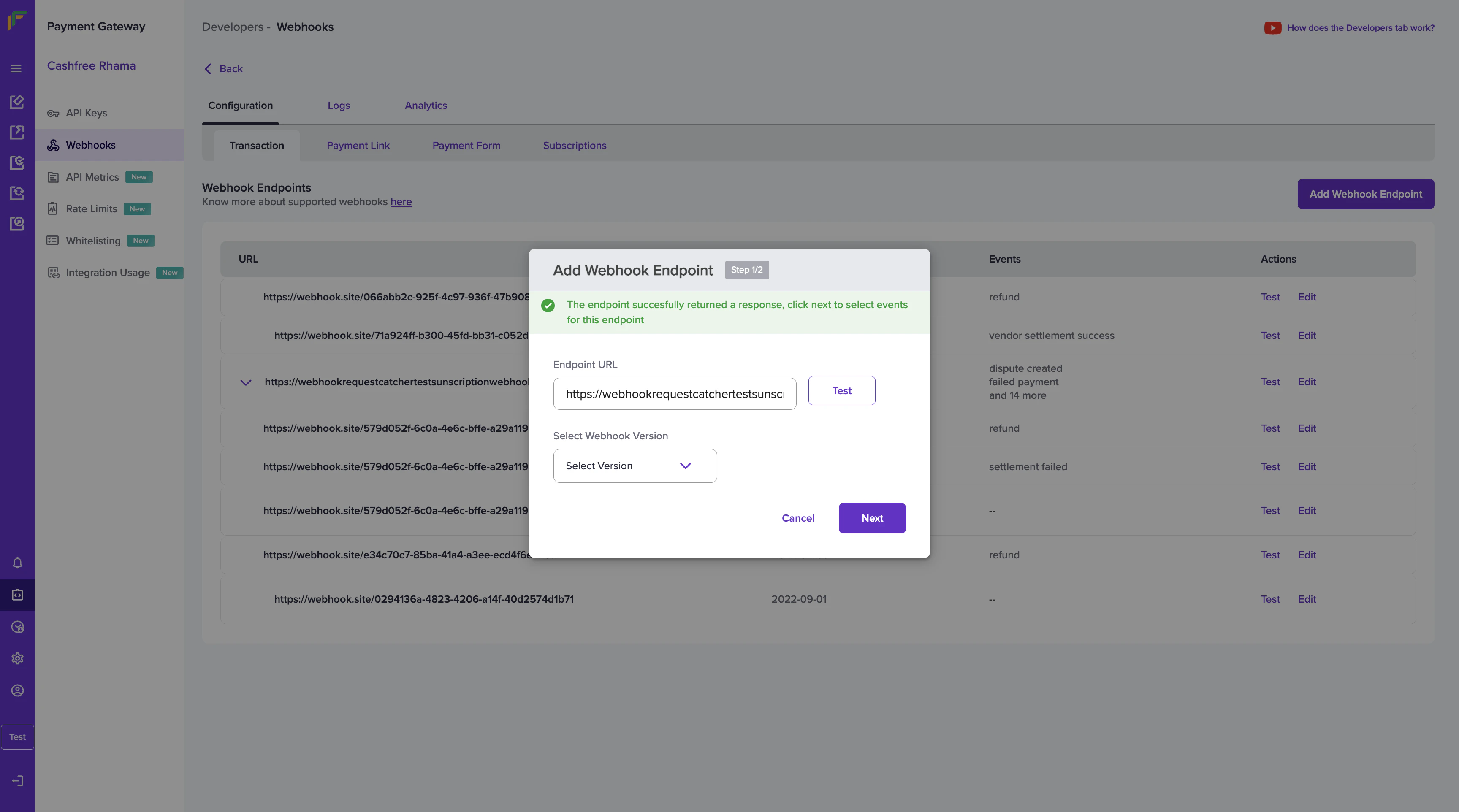 - Click Add Webhook Endpoint to create a new webhook. Enter the endpoint URL and select the webhook version using the drop-down menu. The available webhook versions are: 2022-09-01, 2023-08-01. Click on Test to verify if the webhook endpoint returns a response. Once done, click Next.