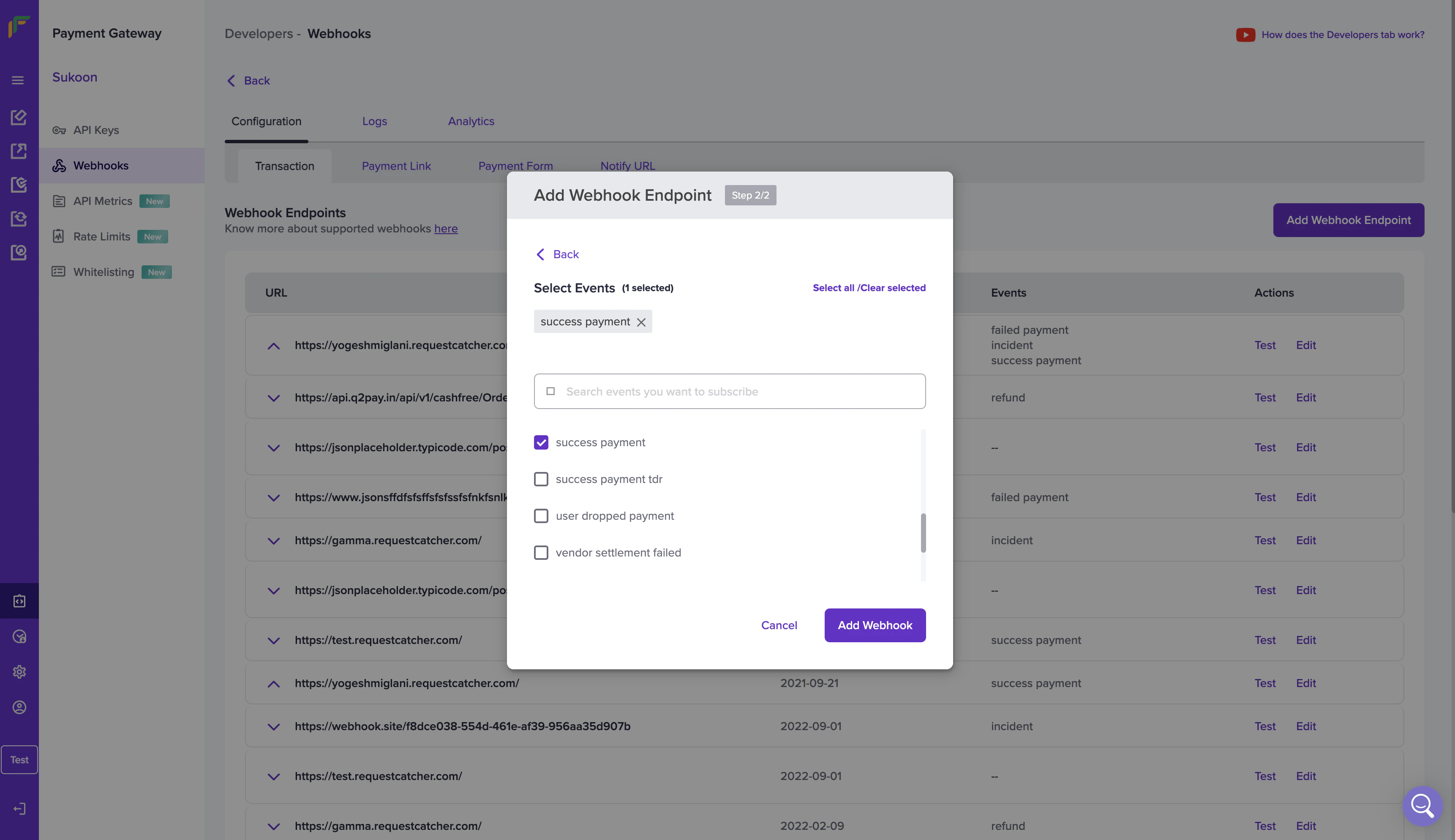 - Select the events for which you want to configure the webhooks and click Add Webhook. The available events are: