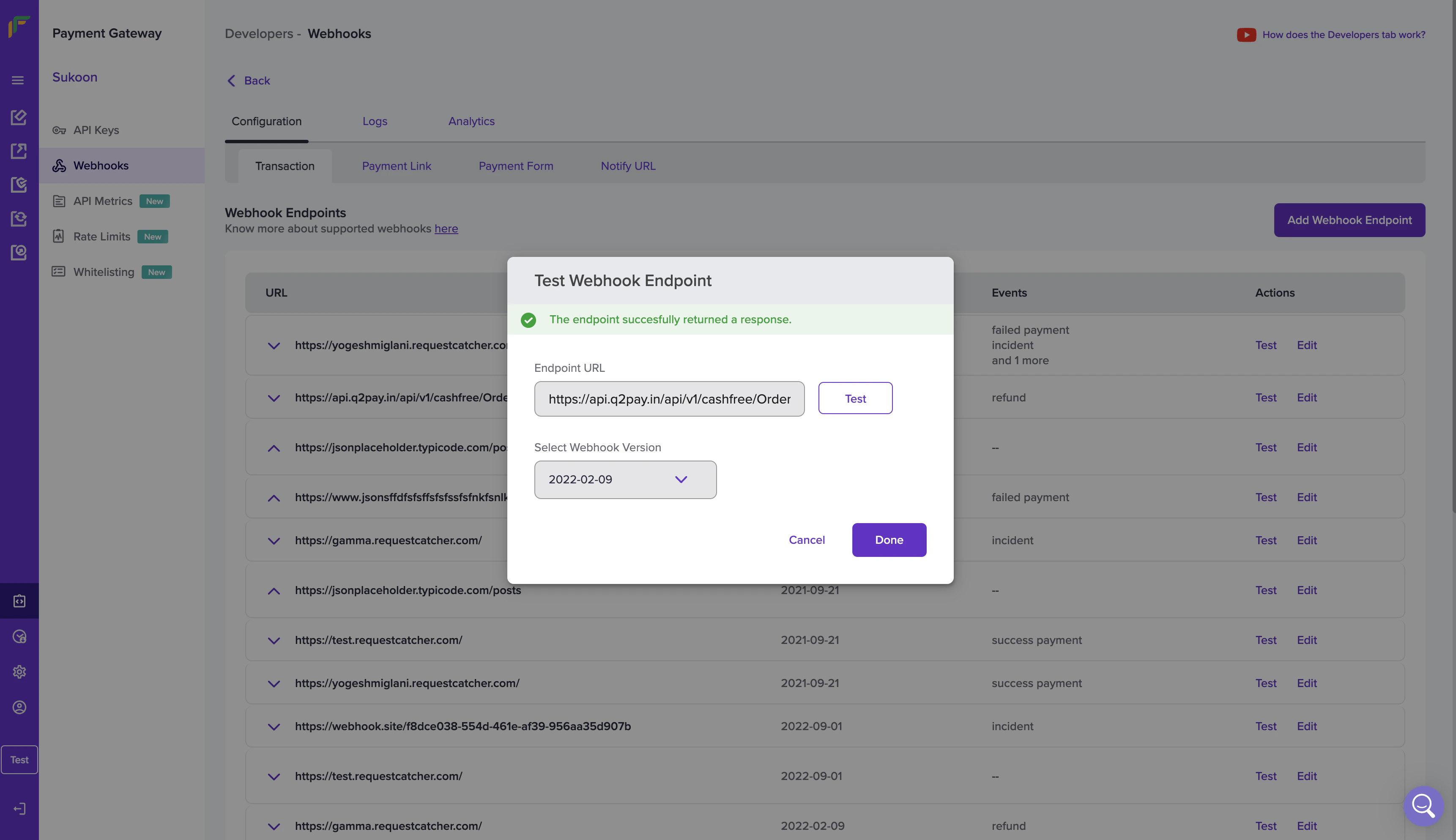 You can test the URL at any time using the Test option. Click the Test option in the Test Webhook Endpoint pop-up. Click Done once you get a success response.