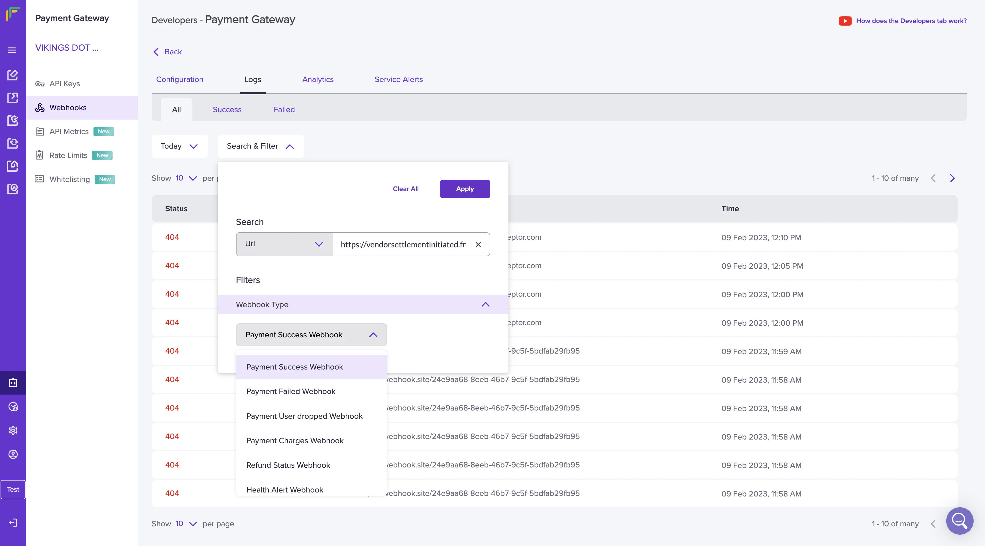 The Logs section allows you to view all webhook logs(successful or failed) on your dashboard. Specify the date range to view logs for a particular period.