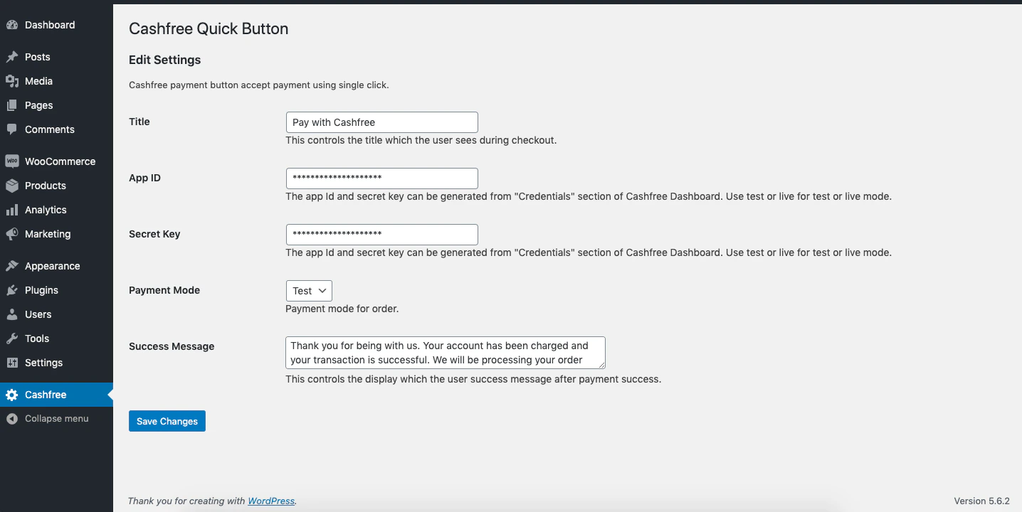 2. In the Edit Settings screen, enter the Title, App ID, Secret Key, Payment Mode (Test/Prod) and the Success Message. Click Save Changes.