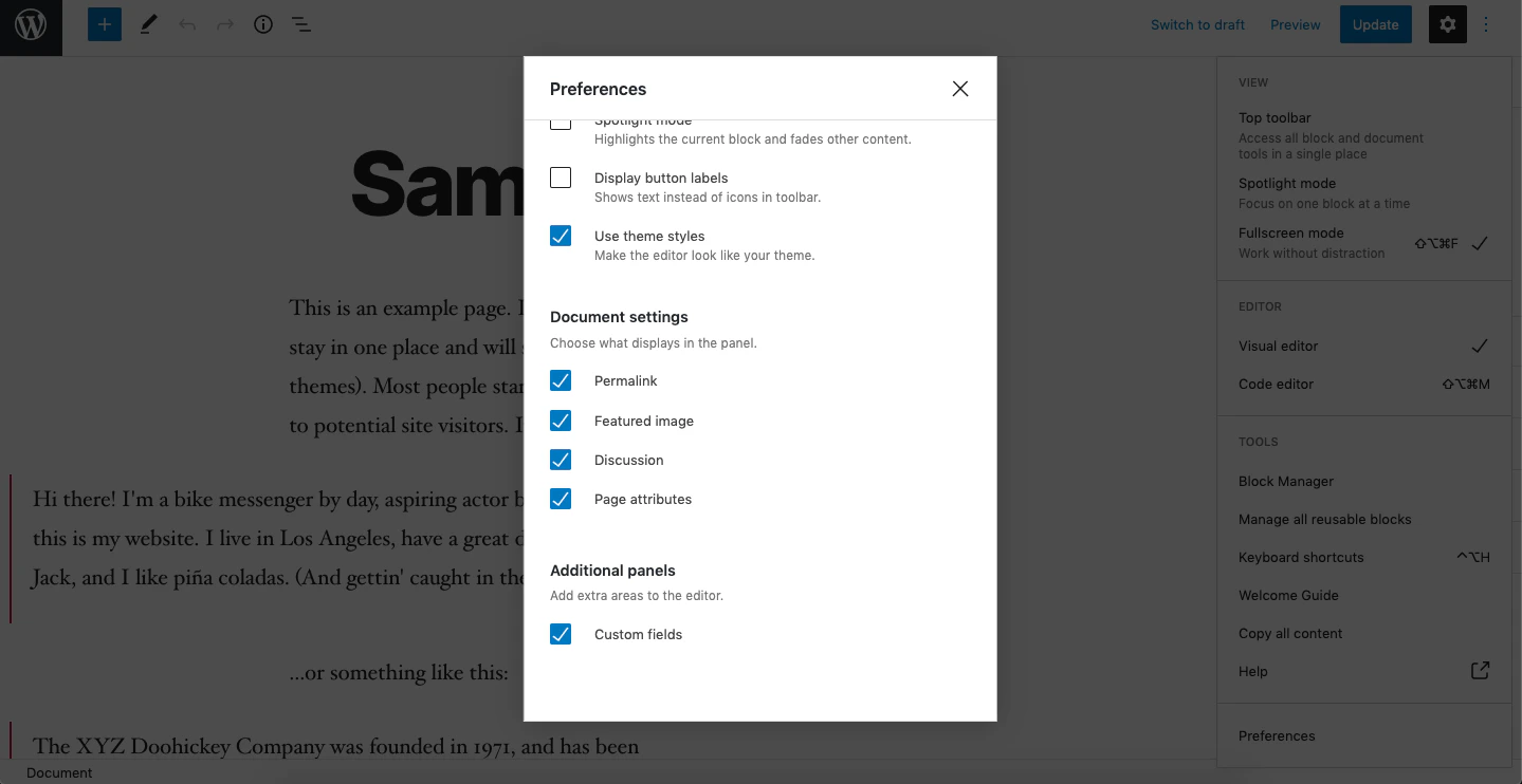 3. In the Preferences screen, enable the option Custom fields. You will now have the option to add custom fields to your WordPress page.