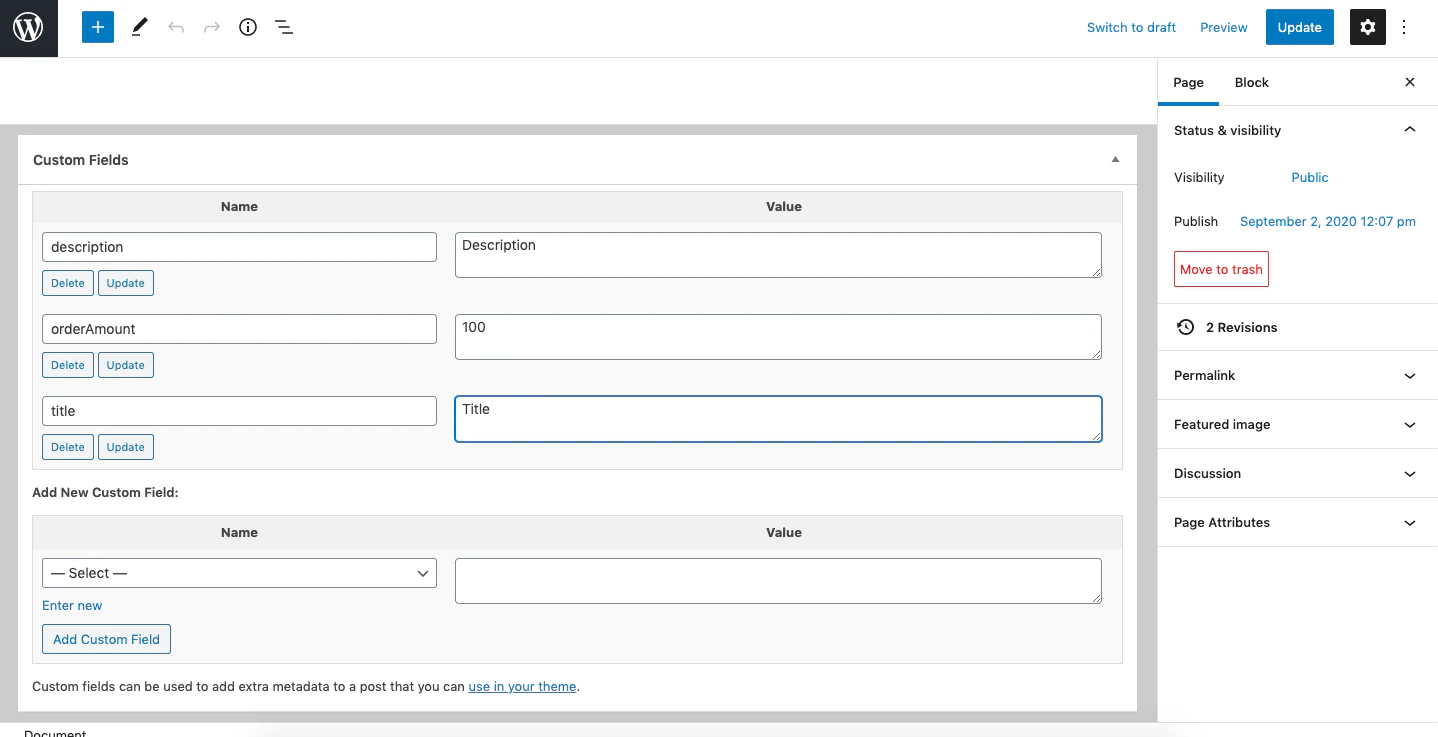 • Specify the amount, title, description and other custom details as page metadata.
