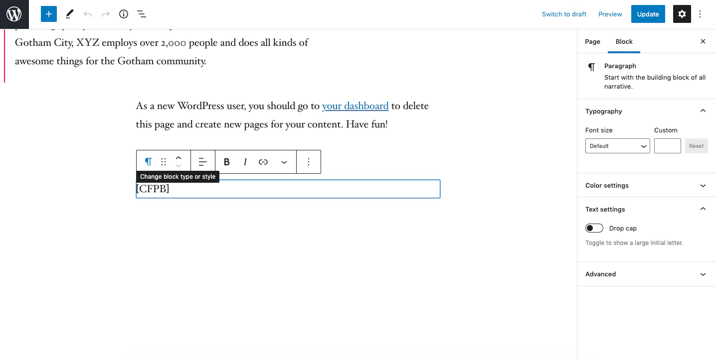 • Write [CFPB] where you want the Pay With Cashfree button to be displayed. The plugin takes over and completes the payment after customers click the payment button.