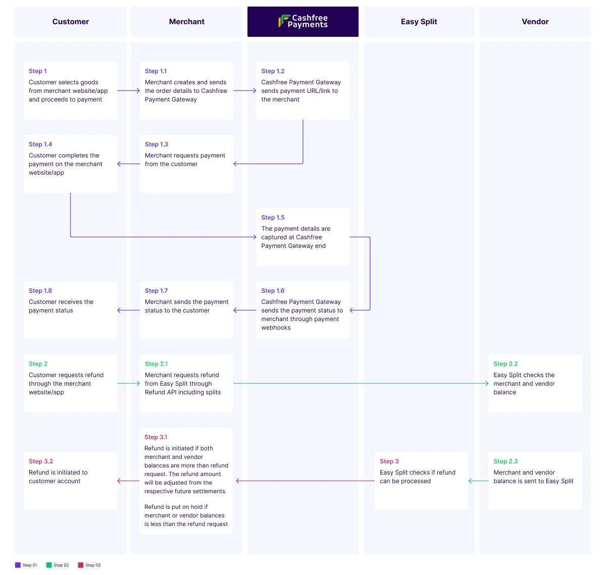 • Step 3.1: Refund is initiated if both merchant and vendor balances are more than the refund request. The refund amount will be adjusted from the respective future settlements. Cashfree Payment Gateway processes the refund based on the refund details directly to the customer account. The refund is put on hold if merchant or vendor balances are less than the refund request.