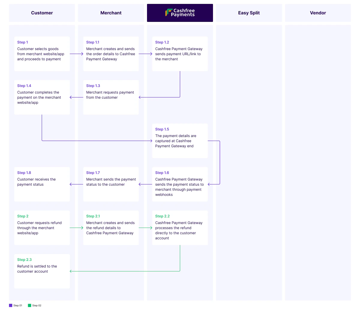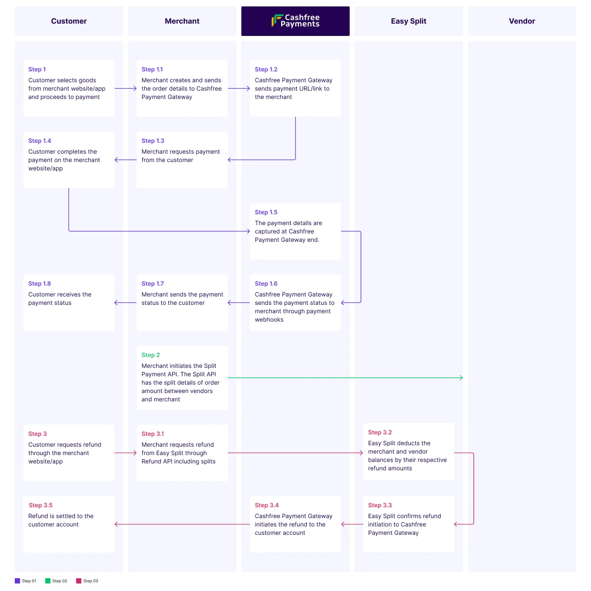 • Step 3.3: Easy Split confirms the refund initiation to Cashfree Payment Gateway and begins processing the refund.