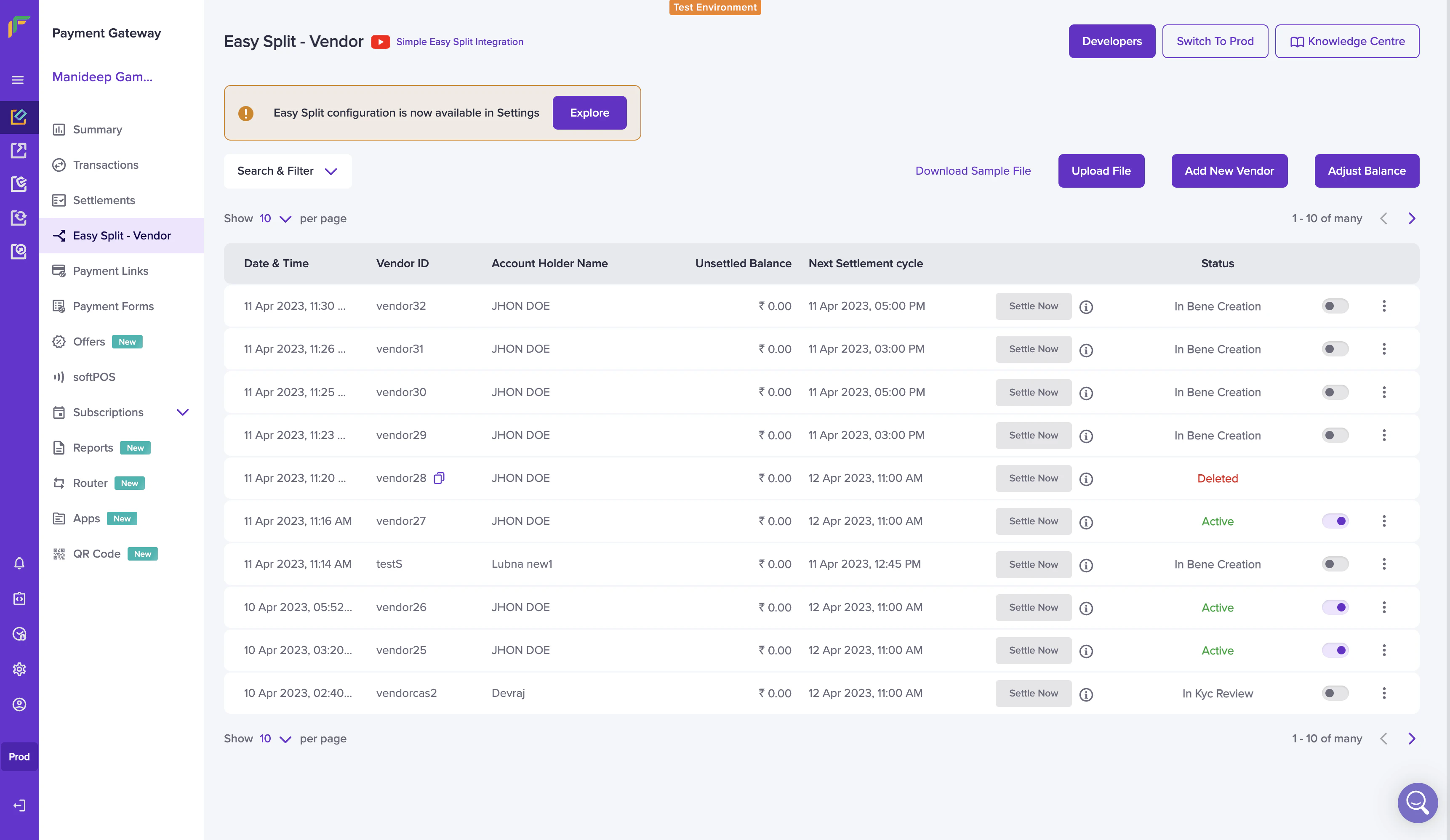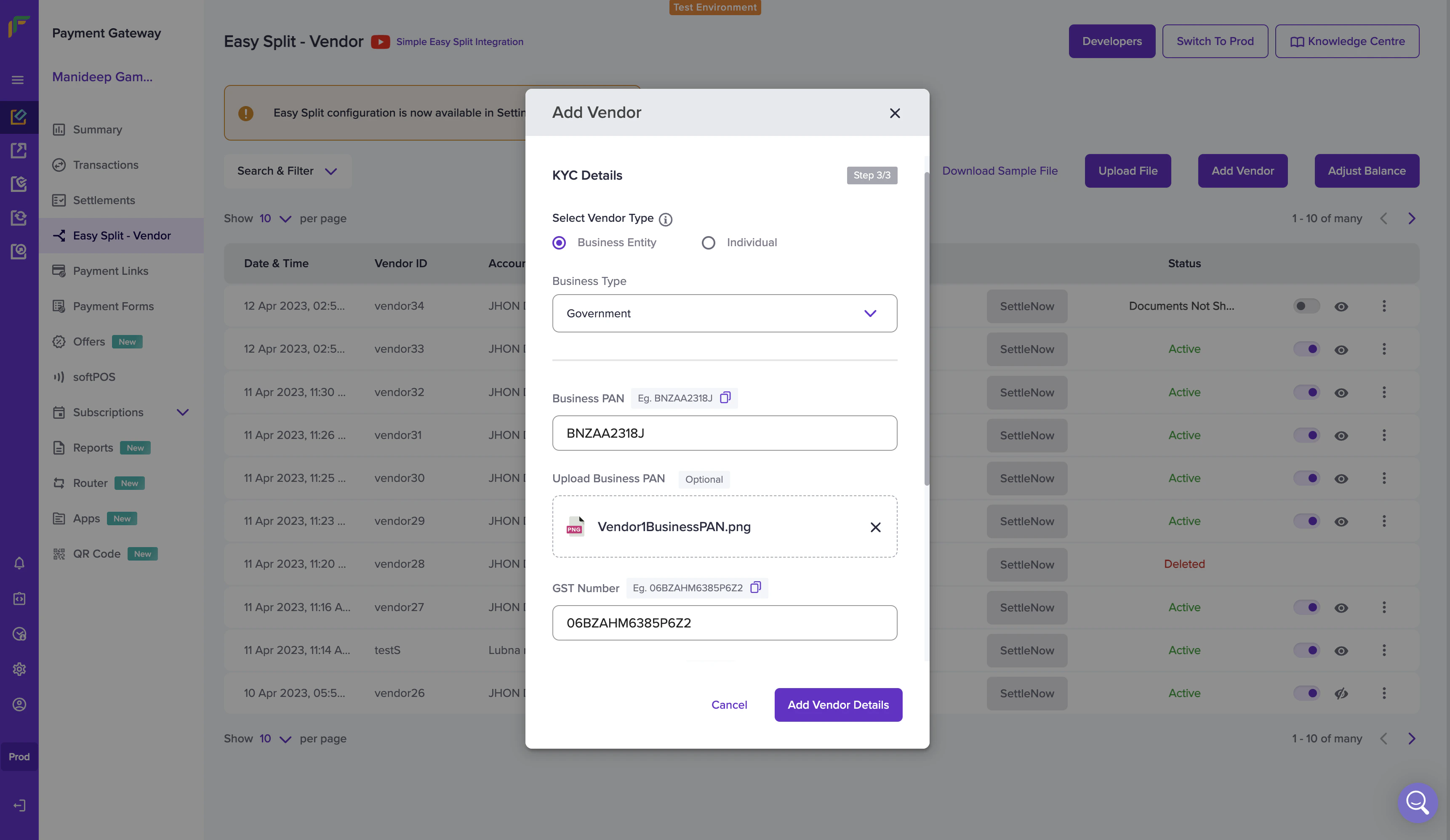 - Once done, click on Add Vendor Details. The vendor is added successfully. Vendor details are saved and can be used to process payments. The vendor details will be shown in the Easy Split - Vendor screen.