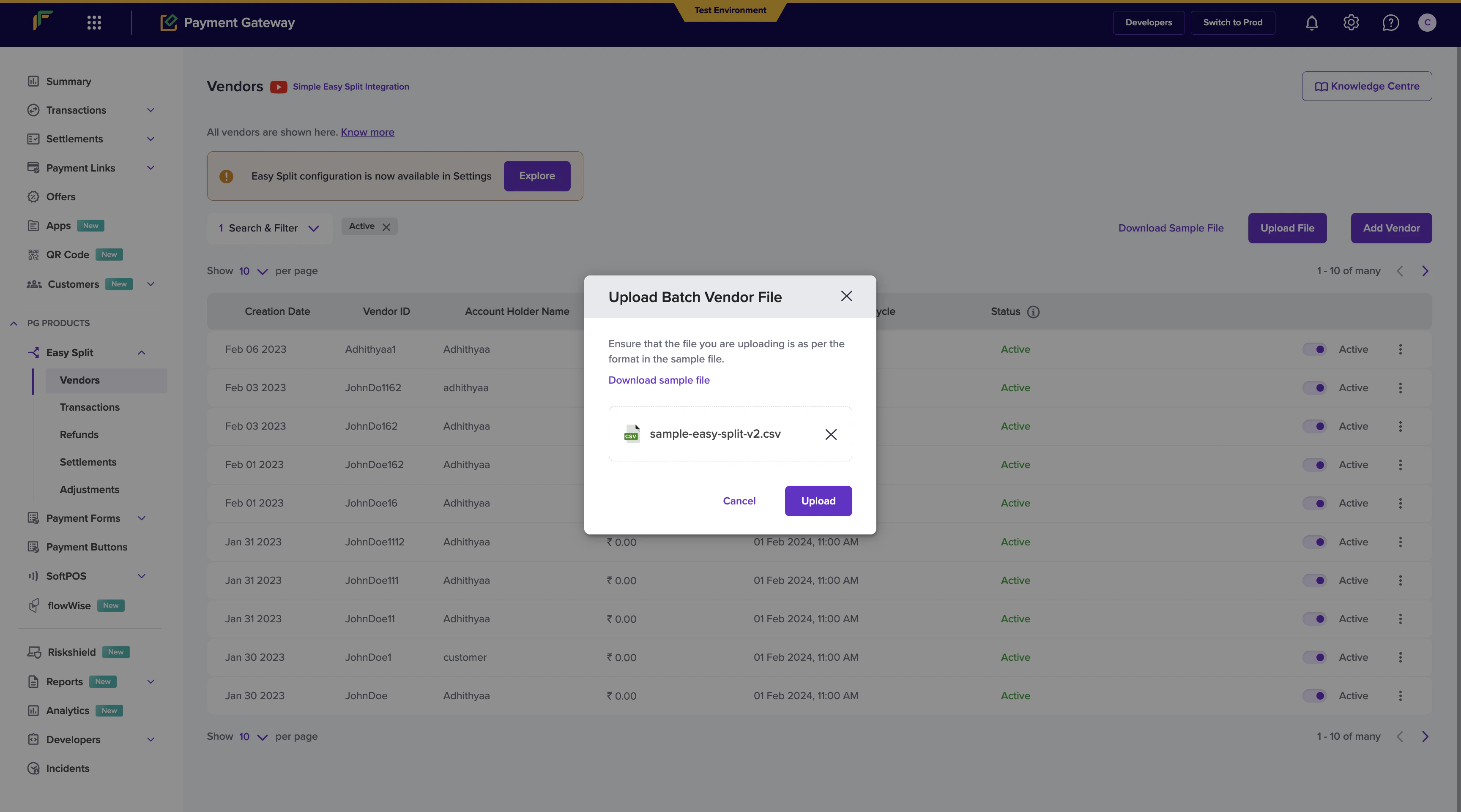 Use the Batch Upload feature to add a large number of vendors at a time. Add all the required details in a single file as per the required format and upload the file. Download the sample file to know what details are required to be filled in the batch file. To upload a batch file,- Go to Payment Gateway Dashboard > EasySplit - Vendor > click Upload File.