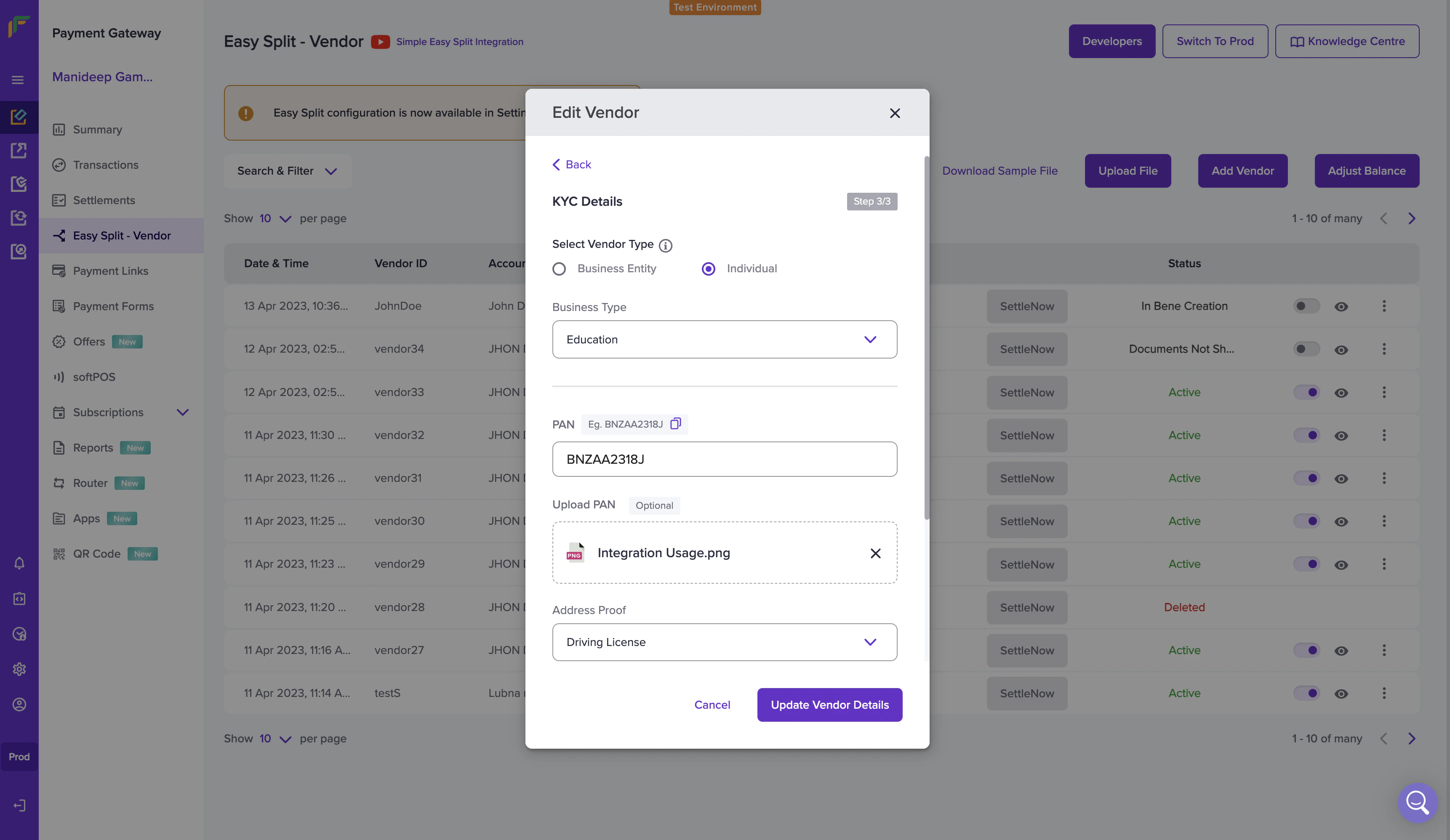 - Go to Payment Gateway Dashboard > Easy Split - Vendor.