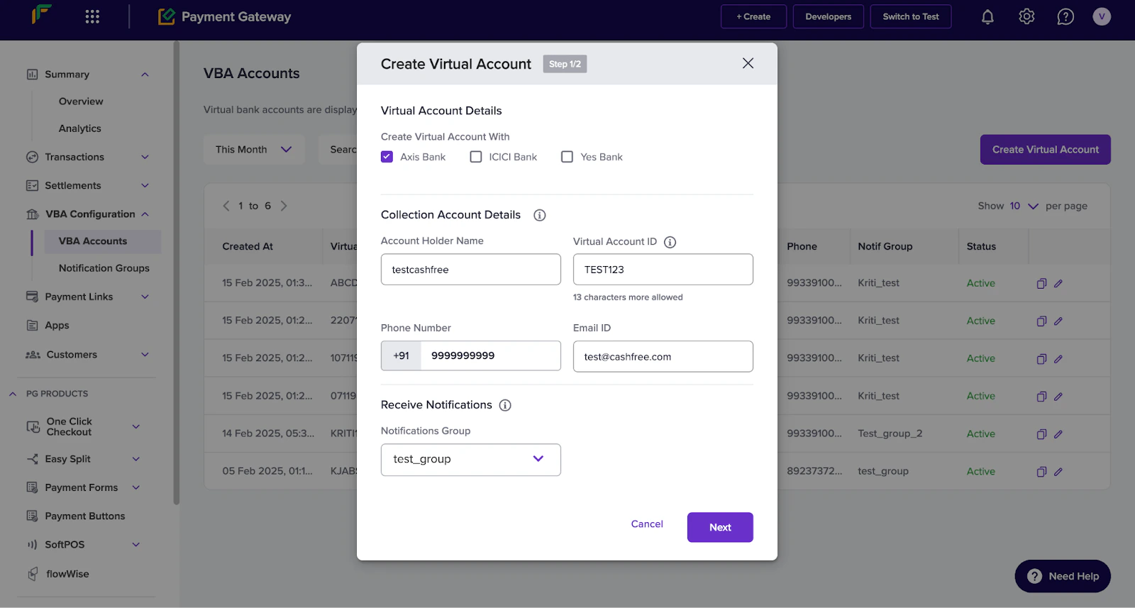 A Virtual Bank Account (VBA) is a unique, temporary bank account that helps businesses collect payments through NEFT, RTGS, and IMPS.