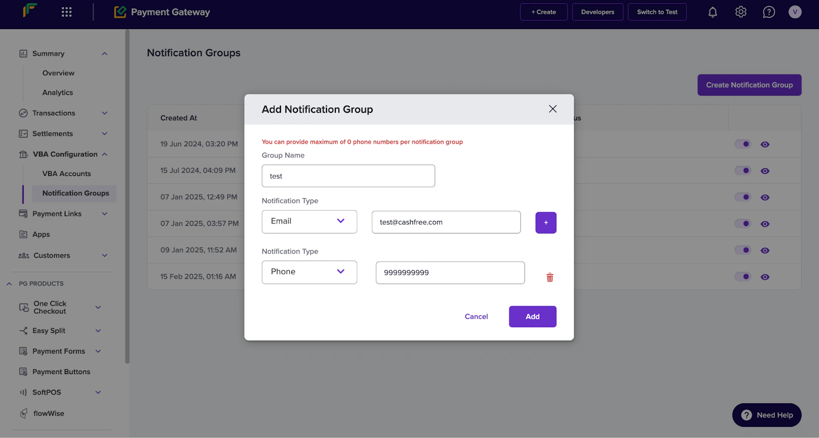 To create a notification group:- Log in to the merchant dashboard using your credentials.