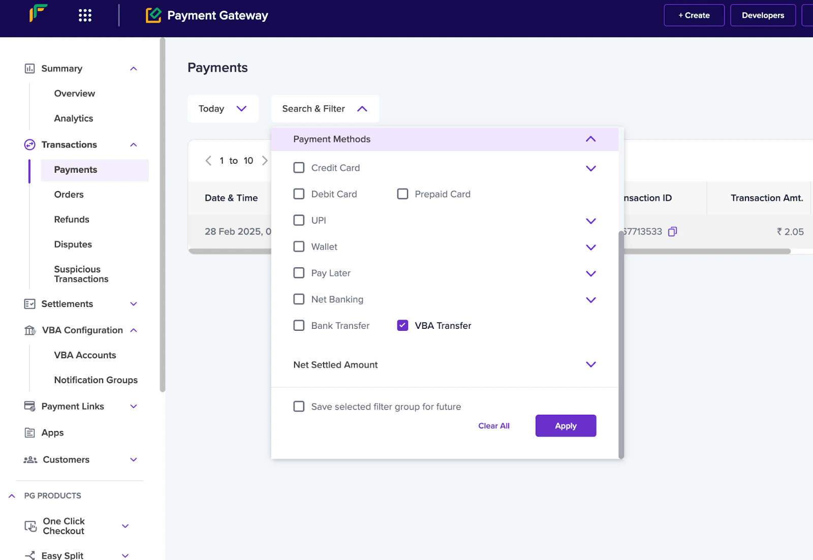 - Select VBA Transfer under the Payment Methods filter. This displays all transactions processed through VBAs.
