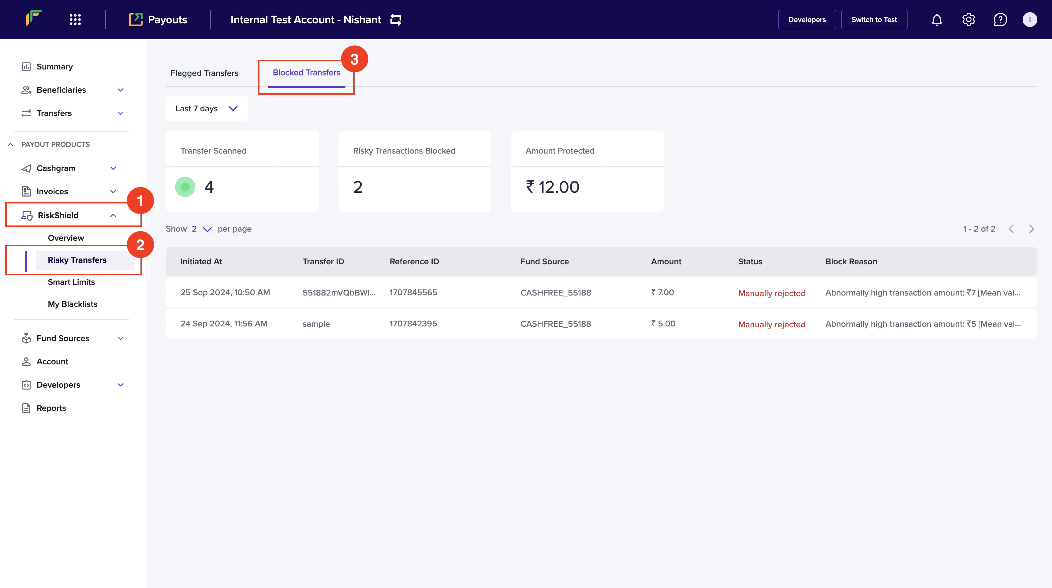 - Navigate to Payout Protect > Risky Transfers.