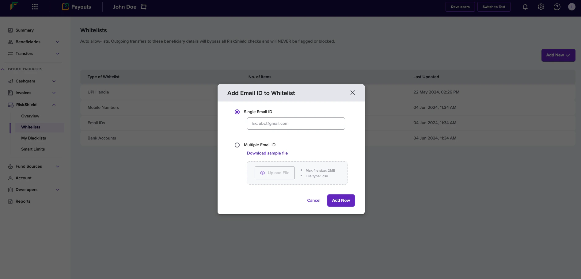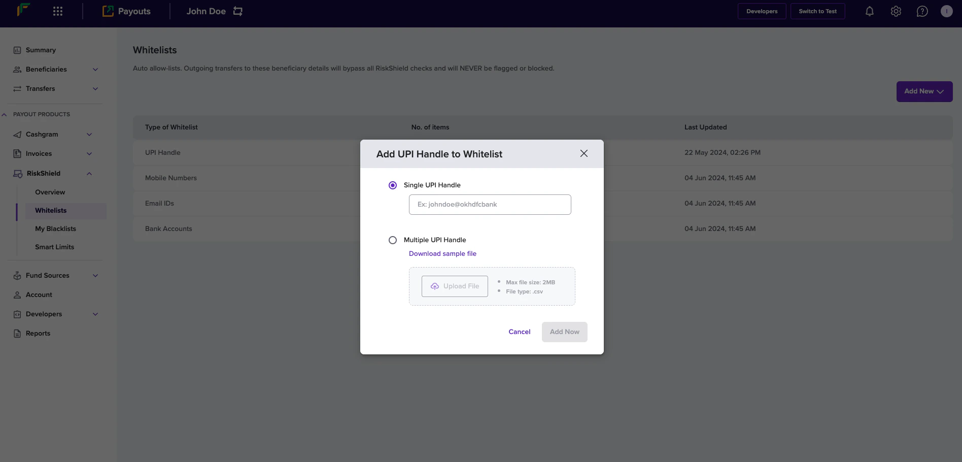 Whitelists allows you to always initiate a transfer to a beneficiary by adding any of the information: mobile number, email address, UPI VPA, or bank account information. Once you login to the Payouts dashboard, navigate to Payout Protect> Whitelists.