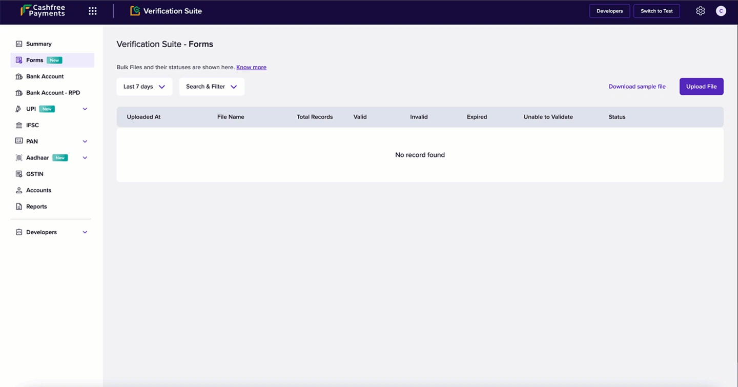 Follow the instructions below to download the sample file:- From the Verification Suite dashboard, click Forms.